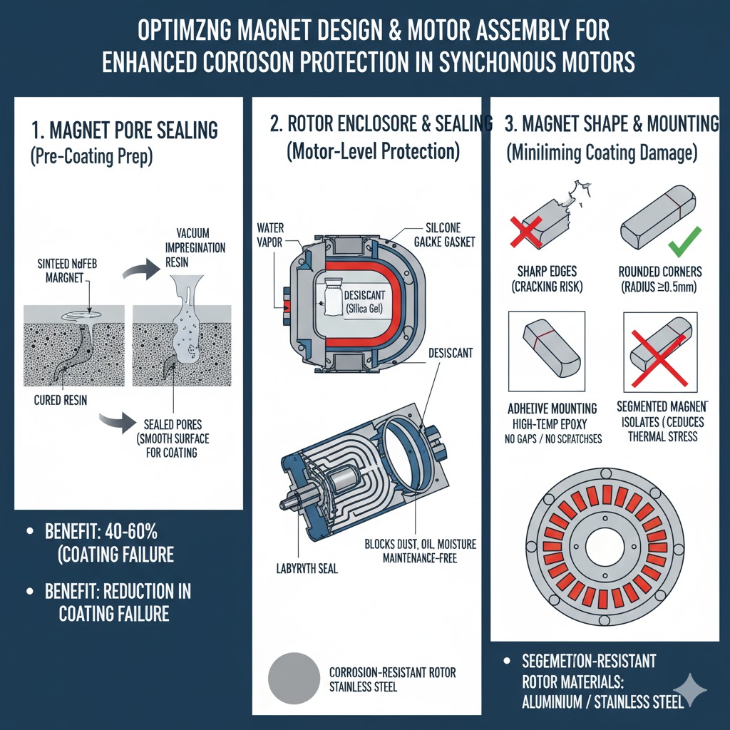Chỉ lớp phủ bề mặt thôi là chưa đủ—các lựa chọn thiết kế cho cụm nam châm và động cơ đóng vai trò quan trọng trong việc giảm thiểu rủi ro ăn mòn. Những tối ưu hóa này bổ sung cho lớp phủ và kéo dài tuổi thọ nam châm: