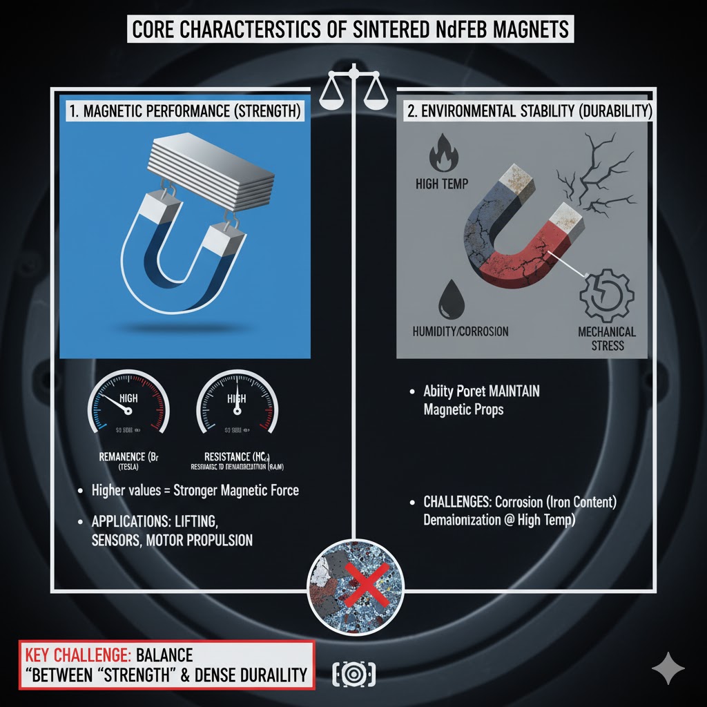 Nam châm thiêu kết NdFeB (Neodymium-Iron-Boron) là một trong những nam châm vĩnh cửu mạnh nhất hiện có, được sử dụng rộng rãi trong các ngành công nghiệp như điện tử, ô tô và năng lượng tái tạo. “Đặc điểm cốt lõi” của chúng xoay quanh hai đặc tính mâu thuẫn nhưng quan trọng: hiệu suất từ tính và độ ổn định môi trường. Hiệu suất từ tính được xác định bằng các số liệu như từ dư (Br, mật độ từ thông tối đa) và lực cưỡng bức (HcJ, khả năng chống khử từ)—giá trị cao hơn có nghĩa là lực từ mạnh hơn cho các nhiệm vụ như nâng, kích hoạt cảm biến hoặc đẩy động cơ. Ngược lại, độ ổn định đề cập đến khả năng nam châm giữ lại các đặc tính này trong các điều kiện khắc nghiệt: nhiệt độ cao/thấp, độ ẩm, ăn mòn hoặc ứng suất cơ học. Nam châm NdFeB thiêu kết truyền thống dễ bị ăn mòn một cách tự nhiên (do hàm lượng sắt) và có thể mất từ tính ở nhiệt độ cao, khiến việc cân bằng giữa "sức mạnh" và "độ bền" trở thành thách thức chính đối với nhà sản xuất cũng như người dùng.